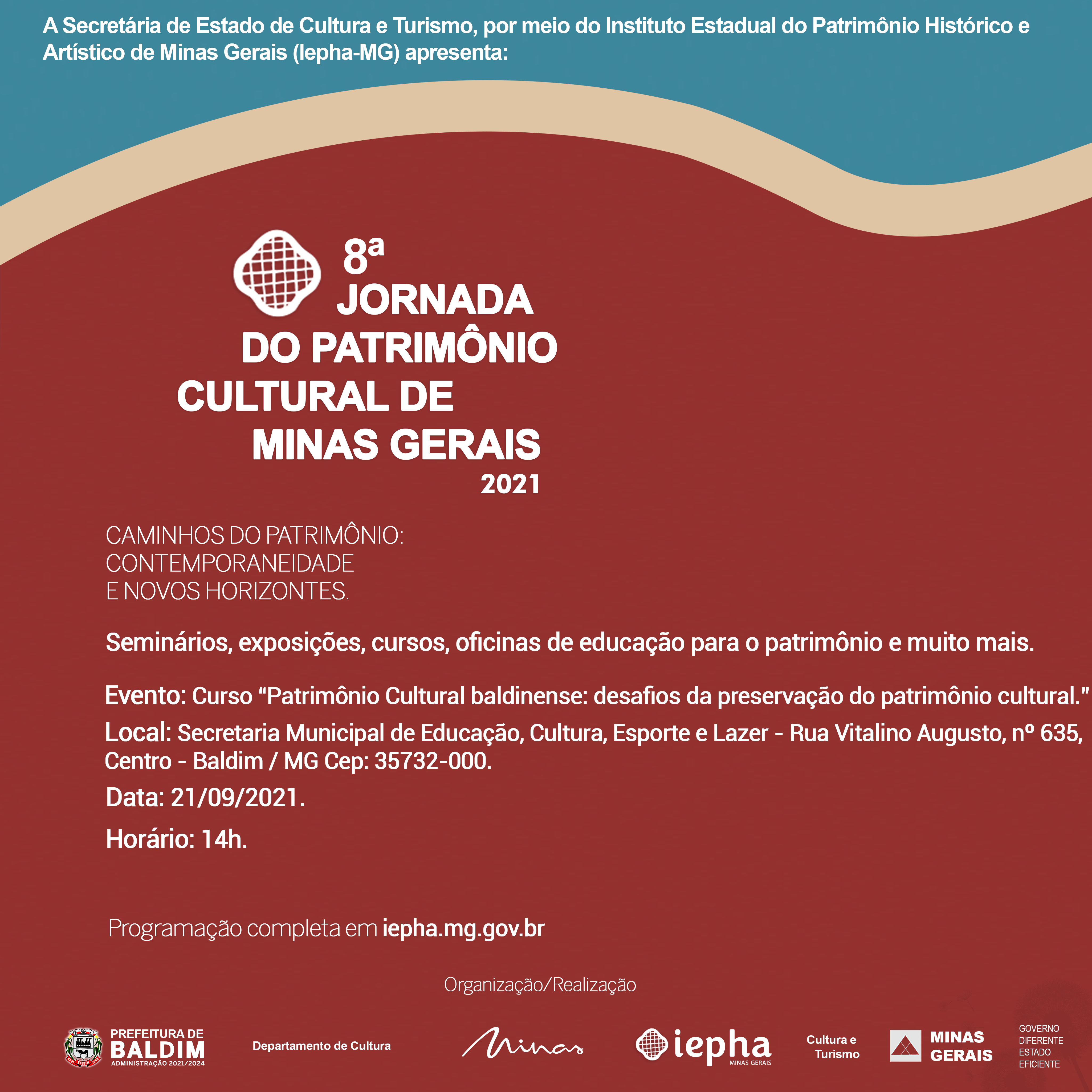 A realização deste curso é uma ação voltada para a participação do município de Baldim na 8ª Jornada do Patrimônio Cultural de Minas Gerais, edição 2021 - IEPHA/MG, cuja proposta é o tema "Caminhos do Patrimônio: contemporaneidade e novos horizontes".