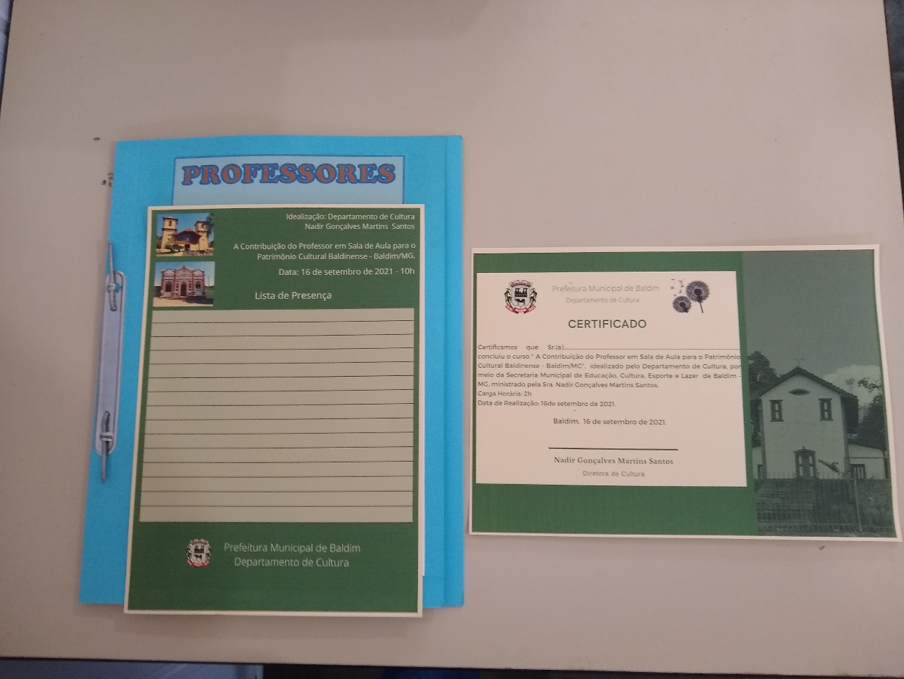 No dia 16 de setembro de 2021, na Prefeitura Municipal de Baldim, situada na Rua Vitalino Augusto, 635, Centro, Baldim (MG), na sala da Secretaria Municipal de Educação, Cultura, Esporte e Lazer, foi realizado o curso "A Contribuição do Professor em Sala de Aula para o Patrimônio Cultural Baldinense - Baldim/MG". Este curso foi ministrado e idealizado pela Sra. Nadir Gonçalves Martins Santos, Diretora de Cultura.