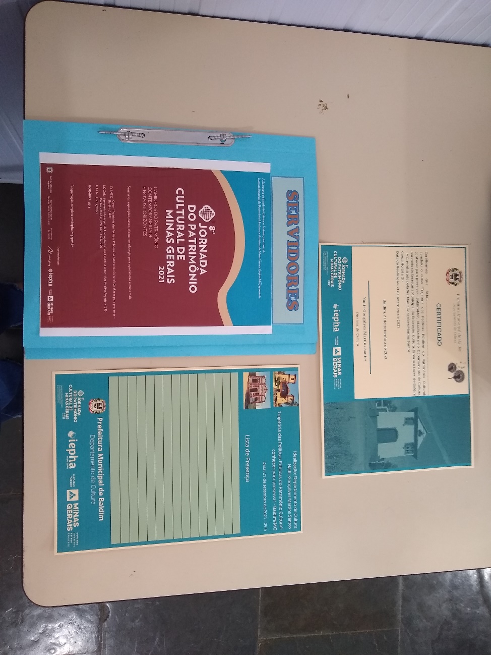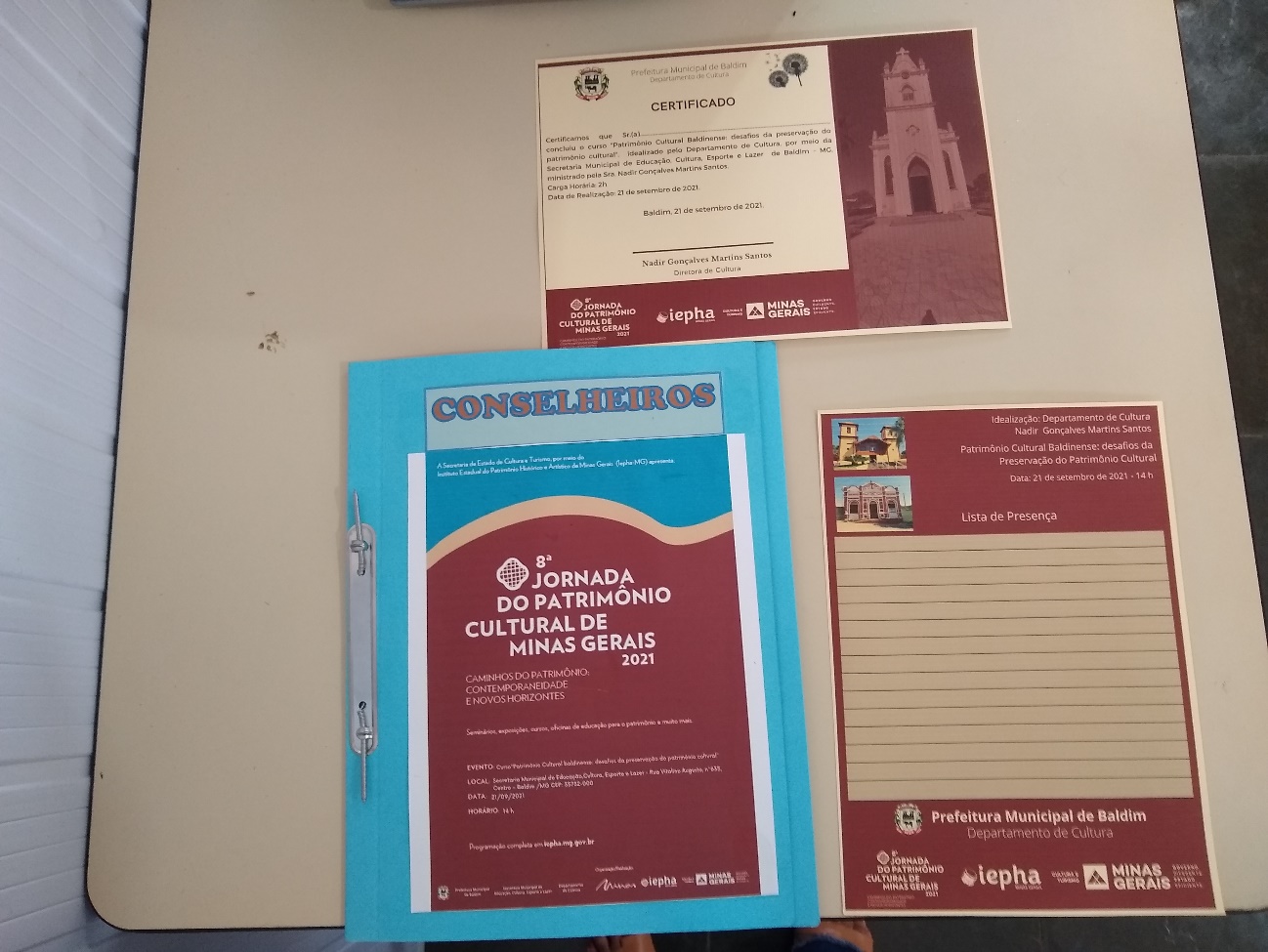 Em complemento ao curso: “As Legislações de Mãos Dadas com os Investimentos nos Bens Culturais do Município de Baldim / MG”, foram distribuídos panfletos educativos, certificados e fichas de avaliação.
