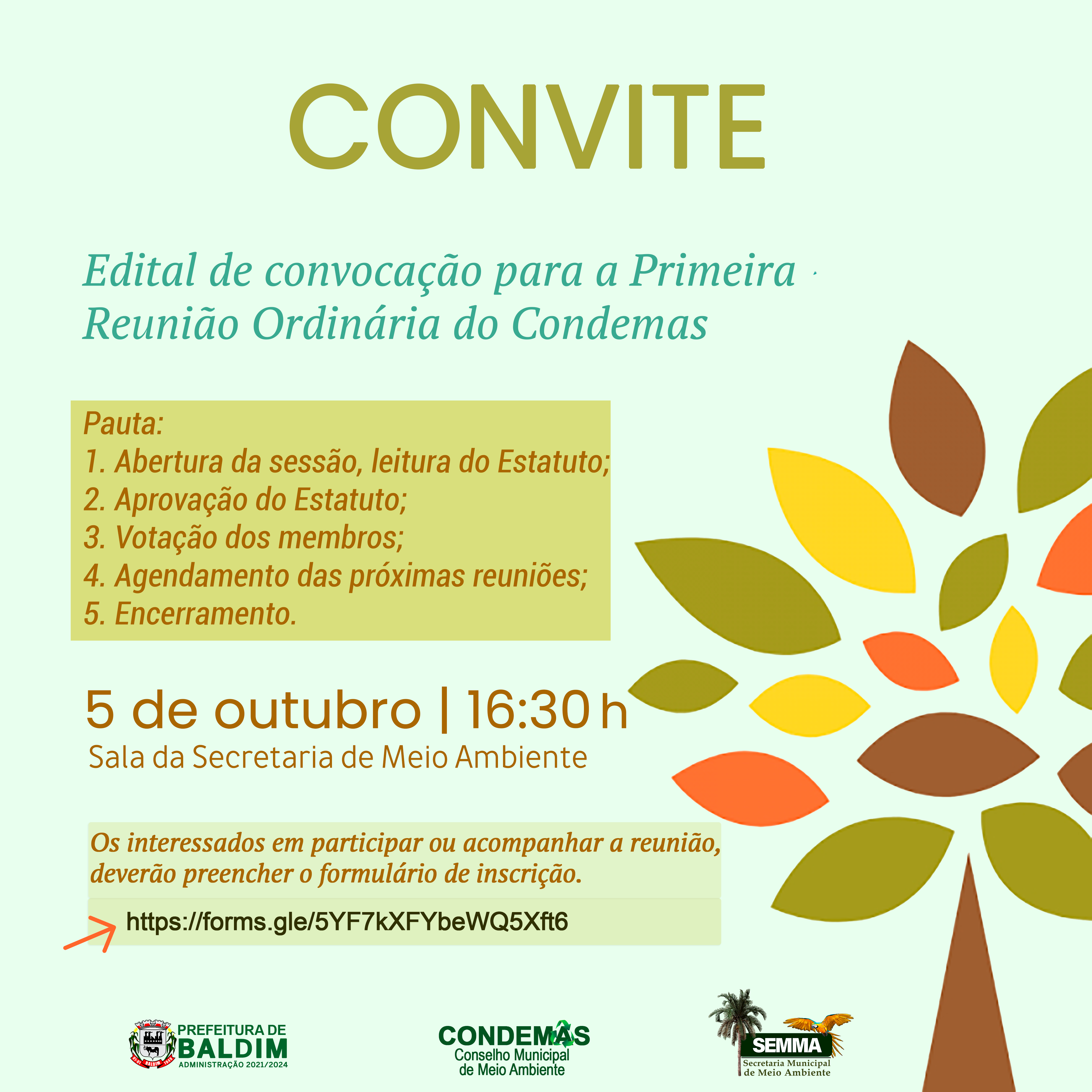 Dando seguimento à estruturação da Secretaria de Meio Ambiente, temos o prazer de convidar todos os interessados para participarem da Primeira Reunião do Conselho Municipal de Desenvolvimento Ambiental e Saneamento - CODEMAS.