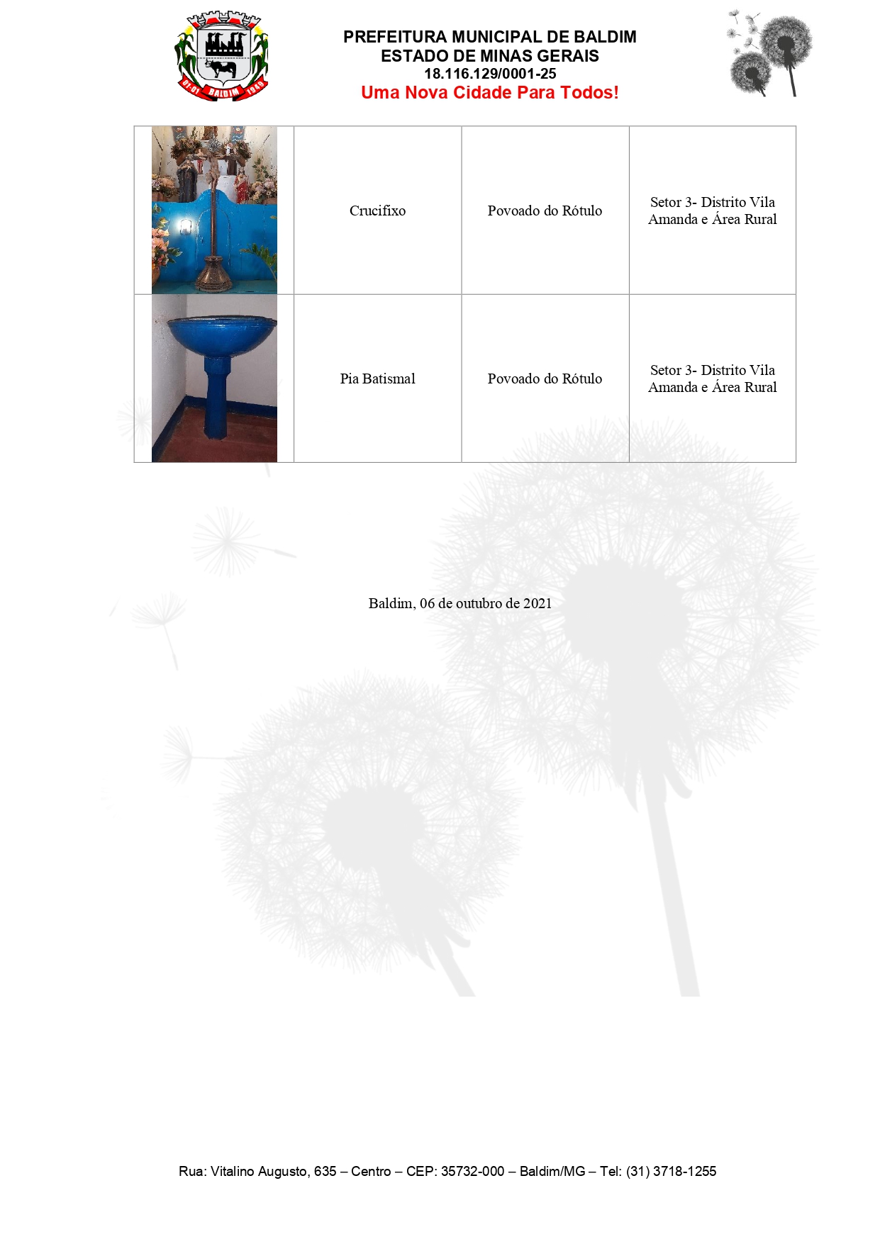 Realizou-se no dia 21/09/2021, às 14:00 h, na Prefeitura Municipal de Baldim, a Rua Vitalino Augusto, 635, Centro, na sala da Secretaria Municipal de Educação, Cultura, Esporte e Lazer, com duração de duas horas, o curso: "Patrimônio Cultural Baldinense: desafios da preservação do patrimônio cultural". Este curso foi ministrado pela Diretora de Cultura, Sra. Nadir Gonçalves Martins Santos.