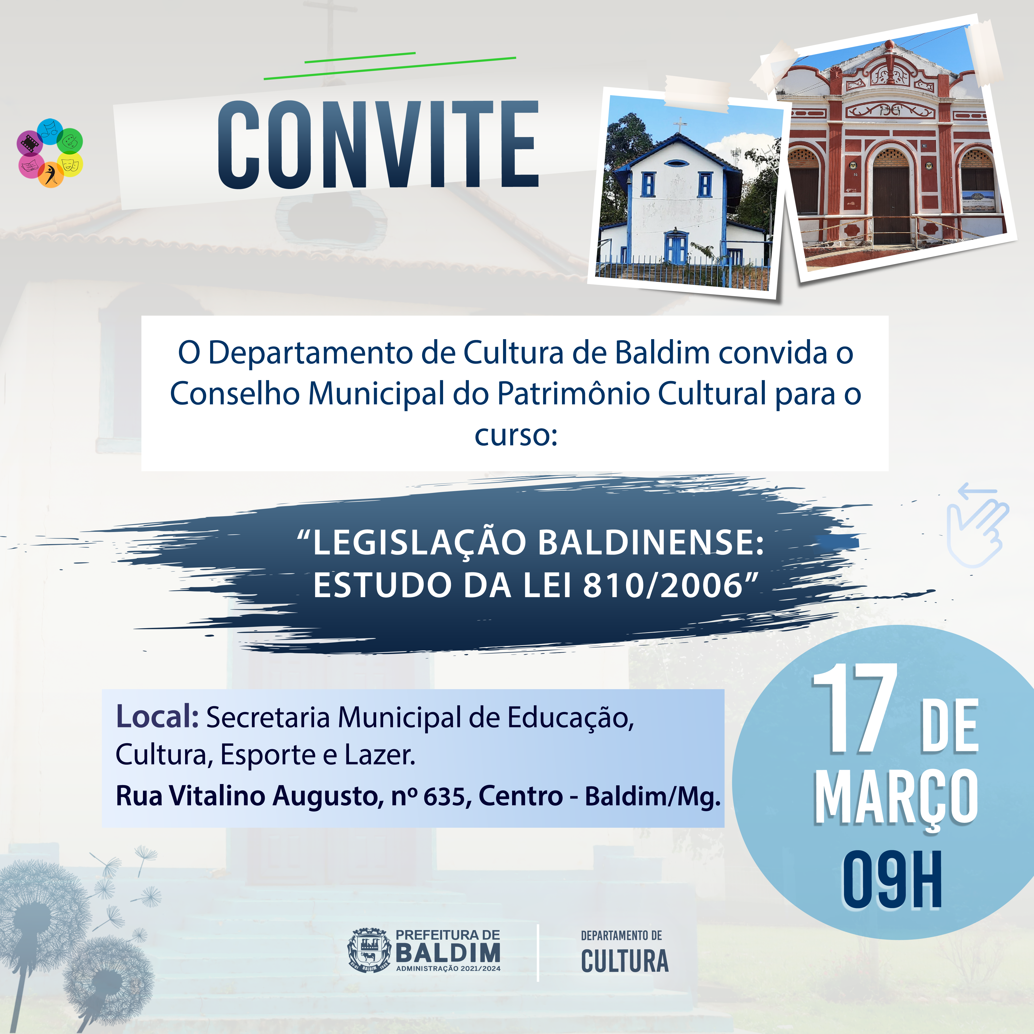 No dia 17 de março de 2022, foi realizado na Secretaria Municipal de Educação, Cultura, Esporte e Lazer, do município de Baldim/MG, o curso: “Legislação Baldinense: Estudo da Lei 810/2006”, ministrado pela Diretora de Cultura, Sra. Nadir Gonçalves Martins Santos. O evento contou com a participação dos membros do Conselho Municipal do Patrimônio Cultural de Baldim.