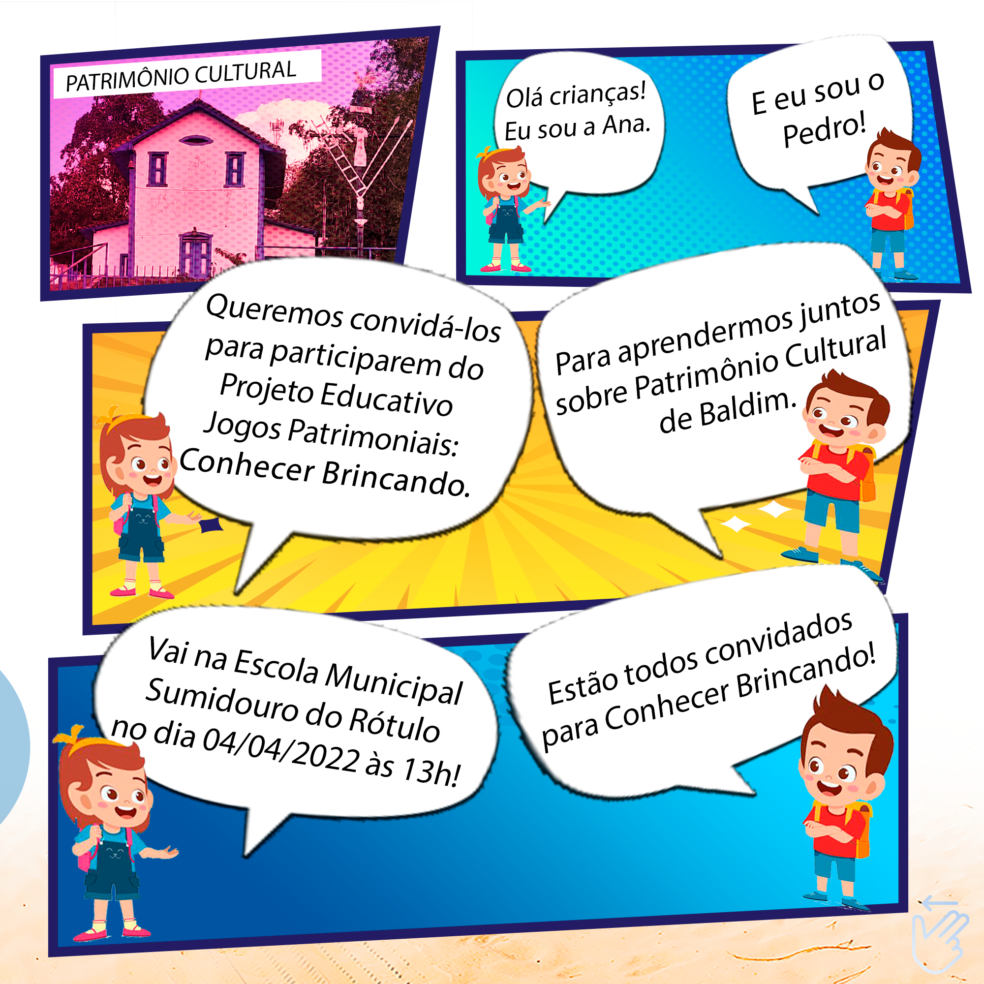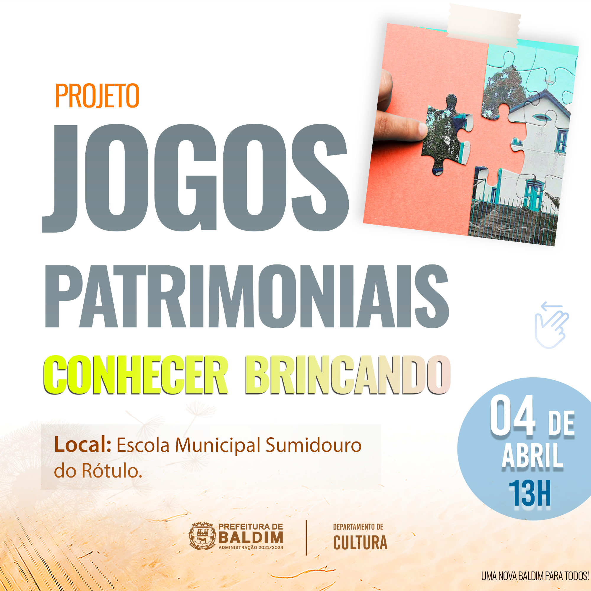 No dia 04 de abril de 2022, foi organizado pela Diretora de Cultura, Sra. Nadir Gonçalves Martins Santos o “Projeto Educativo Jogos Patrimoniais: Conhecer Brincando” junto aos alunos do 4º e 5º anos do Ensino Fundamental da Escola Municipal Sumidouro do Rótulo.
