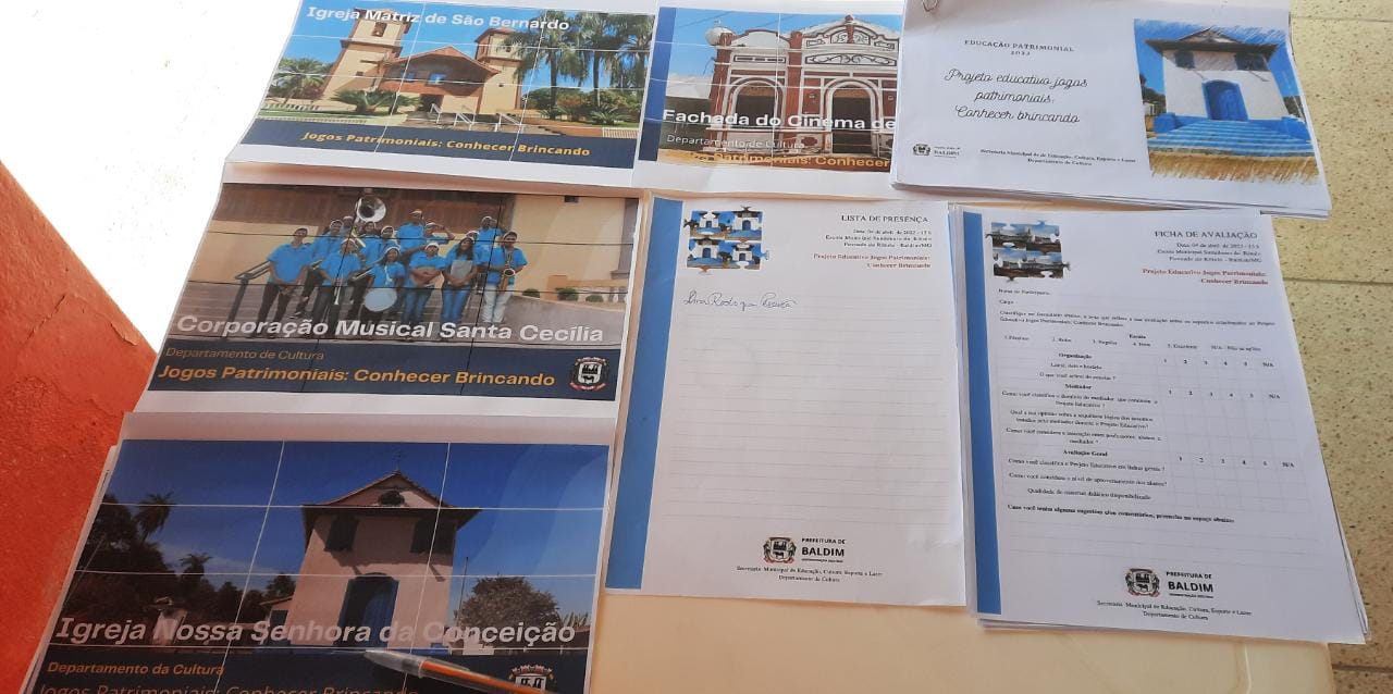 Após a explanação do conteúdo do Projeto, a Diretora de Cultura, Sra. Nadir Gonçalves Martins Santos, realizou uma dinâmica com jogos de quebra-cabeça, confeccionados com material reciclável, pelo Departamento de Cultura e com as imagens de alguns bens culturais do município de Baldim, entre eles: a Igreja Matriz São Bernardo, a Capela de Nossa Senhora da Conceição, a Fachada do Antigo Cinema de São Vicente, o Cemitério do Rótulo e a Corporação Musical Santa Cecília.