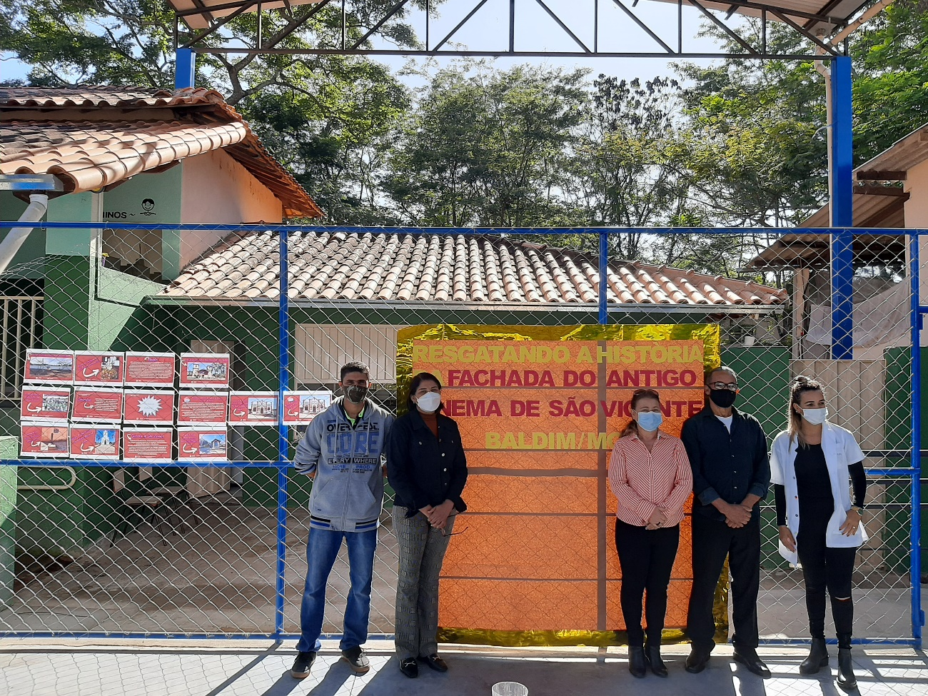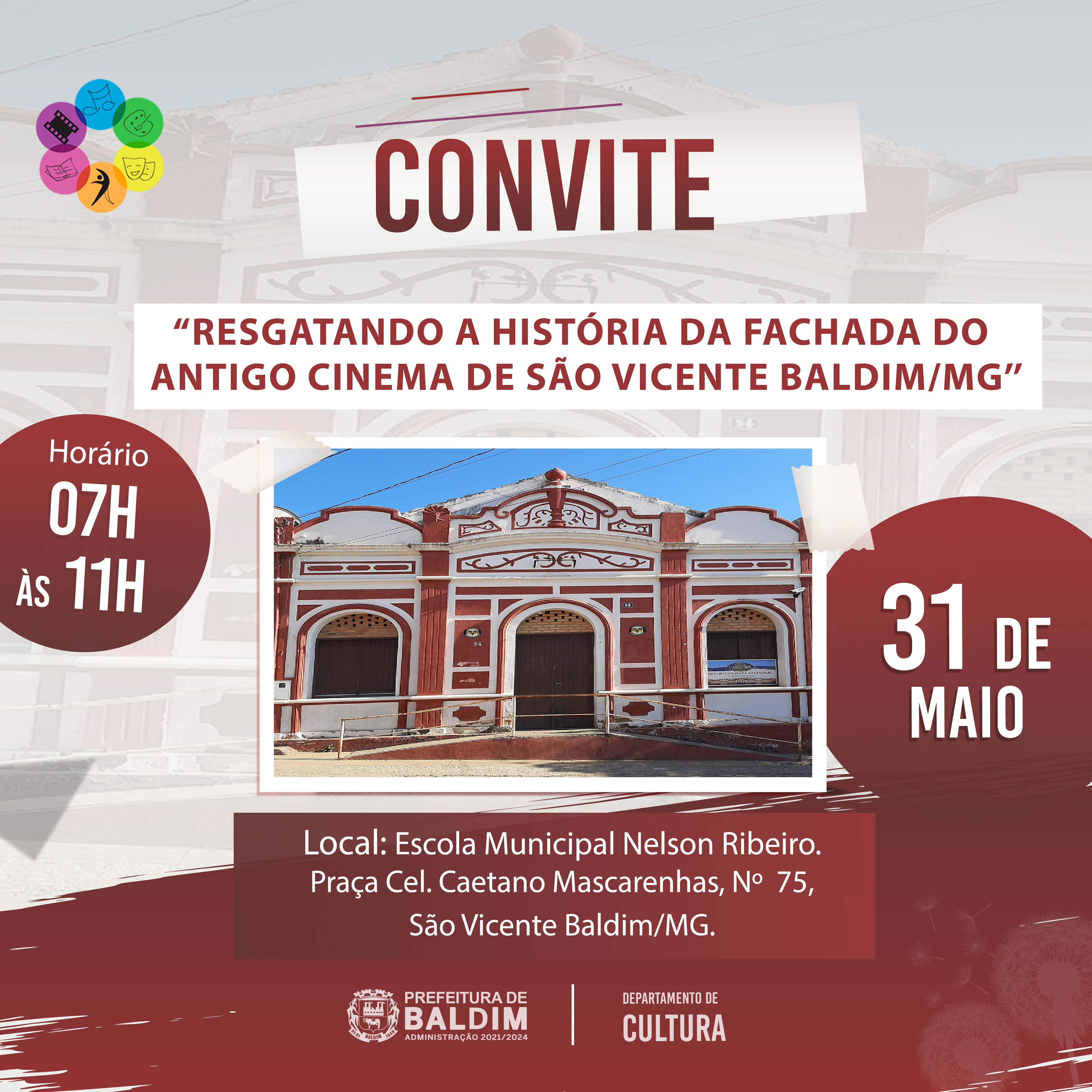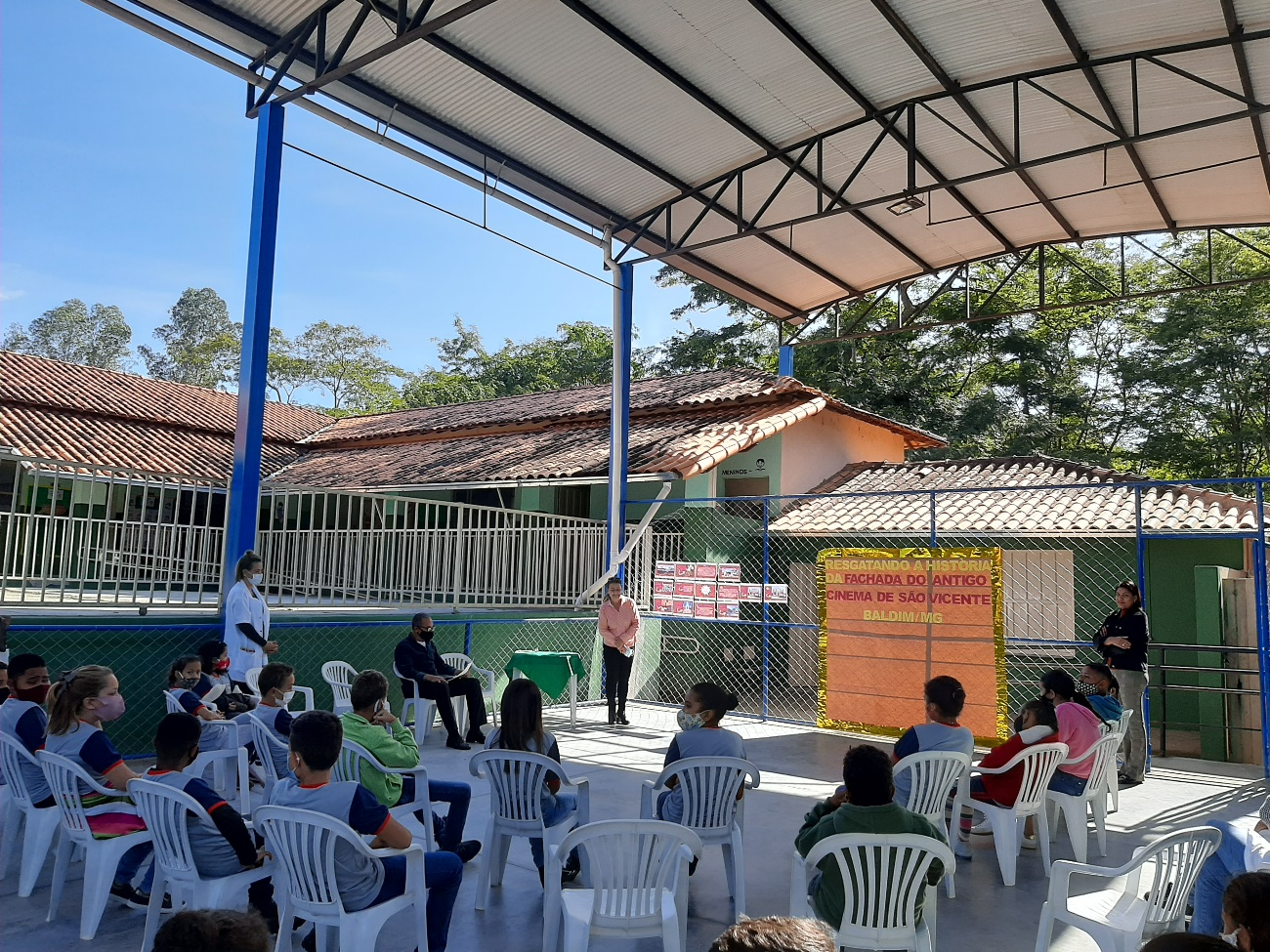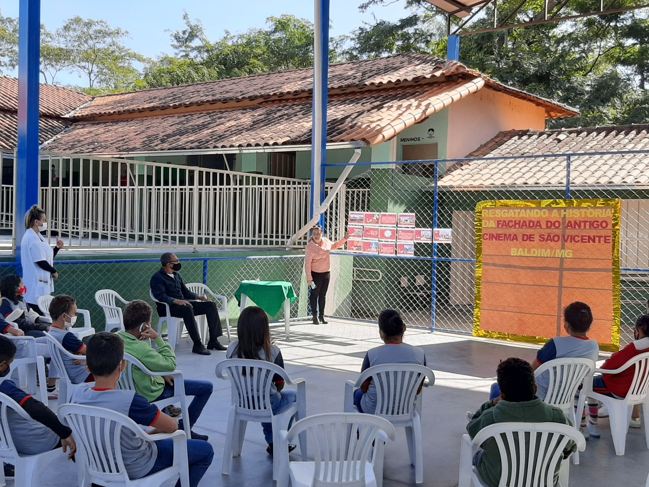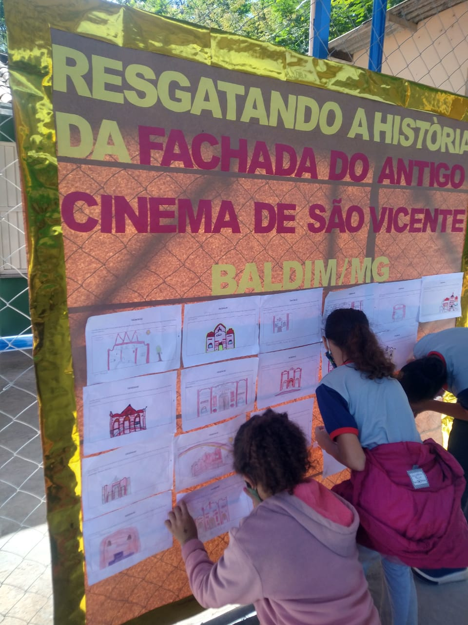 No dia 31 de maio de 2022, o Departamento de Cultura realizou o Projeto “Resgatando a História da Fachada do Antigo Cinema de São Vicente Baldim/ MG” junto à coordenadora, professores e alunos do 5° ano da Escola Municipal Nelson Ribeiro, distrito de São Vicente, Baldim/ MG. Este Projeto foi uma ação de educação para o patrimônio cultural e difusão, cujo objetivo foi a apresentação de conceitos sobre o patrimônio cultural, contextualização sobre a história de Baldim e do Distrito de São Vicente e, estudo da Fachada do Antigo Cinema de São Vicente, bem cultural inventariado no município de Baldim. A ação foi mediada pela Sra. Nadir Gonçalves Martins Santos, Diretora de Cultura. Contou com o apoio da Sra. Madeleine de Souza Gomes, Secretária de Educação, Cultura, Esporte e Lazer e a participação do proprietário do Antigo Cinema de São Vicente, Sr. Nilton Vicente dos Santos. Os alunos interagiram durante as explanações da Sra. Nadir Gonçalves Martins Santos, Sra. Madeleine de Souza Gomes e Sr. Nilton Vicente dos Santos, em seguida todos os participantes da ação foram fazer uma visita guiada à Fachada do Antigo Cinema de São Vicente. Esteve presente também, a equipe da Consultoria do Programa de ICMS Patrimônio Cultural que auxiliou na condução dos trabalhos. No dia 01 de junho de 2022, os alunos realizaram produções de textos e desenhos do Caderno de atividades sobre a Fachada do Antigo Cinema de São Vicente. Os alunos expuseram os desenhos realizados no mural feito para este projeto cuja a finalidade foi mostrar à comunidade escolar o trabalho realizado. Para a Diretora de Cultura, Sra. Nadir Gonçalves Martins Santos, a ação foi satisfatória, pois ocorreu troca de conhecimento, interação e conscientização quanto a importância de cuidar e preservar a história, memória e bens culturais do povo baldinense.