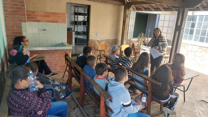 Em seguida, a Diretora de Cultura Sra. Nadir Gonçalves Martins Santos apresentou aos alunos o Maestro e Presidente da Corporação Musical Santa Cecília, Sr. José Ulisses Gonçalves Araújo, para falar um pouco sobre este bem cultural imaterial tão importante para os baldinenses.