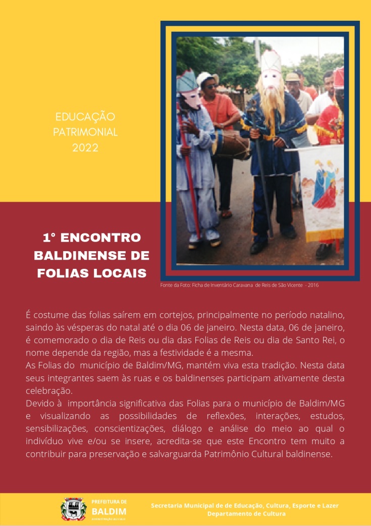 O Departamento de Cultura, através de sua Diretora, Sra. Nadir Gonçalves Martins Santos em função da atual situação em que se encontram as Folias no município de Baldim, devido aos impactos causados pela pandemia do COVID 19 não puderam realizar seus encontros, pois os grupos se desintegraram. Desta forma viu-se a necessidade de reformular as ações já previstas com o objetivo de fomentar o regaste destes encontros. Diante do exposto, dentro da ação “Primeiro Encontro Baldinense de Folias Locais”, foi elaborado panfleto educativo com o objetivo de divulgar informações referentes às folias locais à comunidade baldinense, promovendo sua relevância e importância.