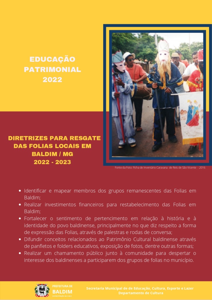 Ainda sobre as folias, vale destacar que como produto da ação educativa foi discutido pelos participantes do Primeiro Encontro Baldinense de Folias Locais (Roda de Conversa), diretrizes para resgate da manifestação cultural no município. A Diretora de Cultura, Sra. Nadir Gonçalves Martins Santos desenvolveu o panfleto educativo “Diretrizes para resgate das folias locais em Baldim/MG 2022-2023”, com as diretrizes propostas pelos participantes.