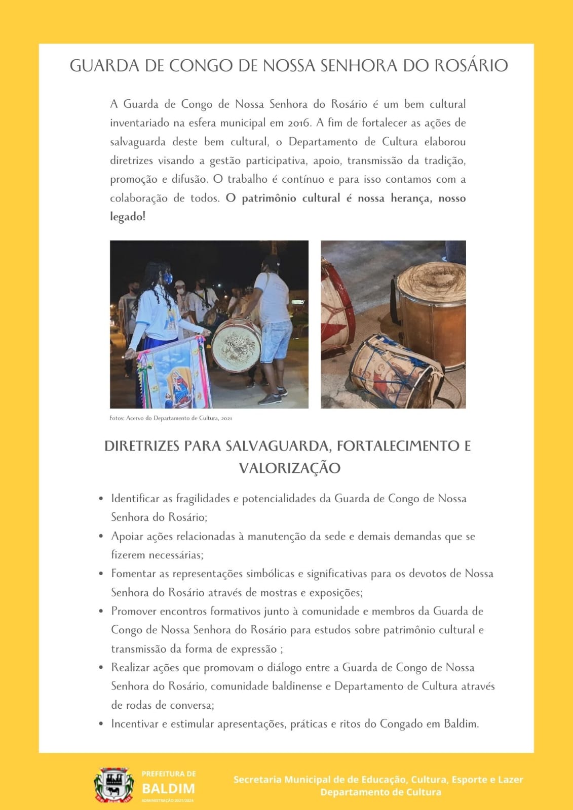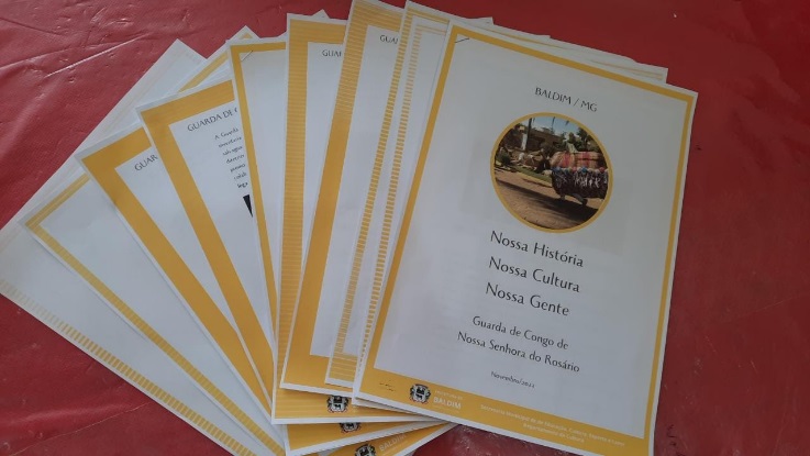 “Nossa História, Nossa Cultura, Nossa Gente – Guarda de Congo de Nossa Senhora do Rosário”, é um panfleto criado pelo Departamento de Cultura, através de sua Diretora, Sra. Nadir Gonçalves Martins Santos, direcionada à Guarda de Congo de Nossa Senhora do Rosário, bem cultural do município de Baldim, inventariado na esfera municipal. O material desenvolvido visa fomentar e levar conhecimento sobre o bem cultural de origem afro-brasileira, através de diretrizes de salvaguarda fortalecimento e valorização da Guarda de congo de Nossa Senhora do Rosário, para que junto à comunidade seja possível a perpetuação da manifestação cultural com perspectivas futuras.