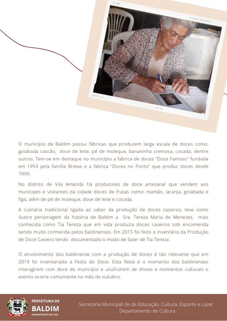 Diante do exposto a Diretora de Cultura, Sra. Nadir Gonçalves Martins Santos com o objetivo de levar conhecimento aos baldinenses, acerca da culinária tradicional ligada a produção de doces no município, desenvolveu um panfleto com conteúdo sucinto, porém informativo a respeito do tema.