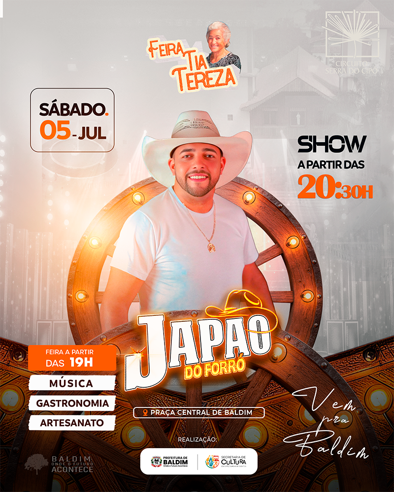 O destaque da noite será o show do cantor Japão do Forró, com início às 20h30. Conhecido por animar o público com grandes sucessos do forró, o artista promete uma apresentação empolgante para toda a família.