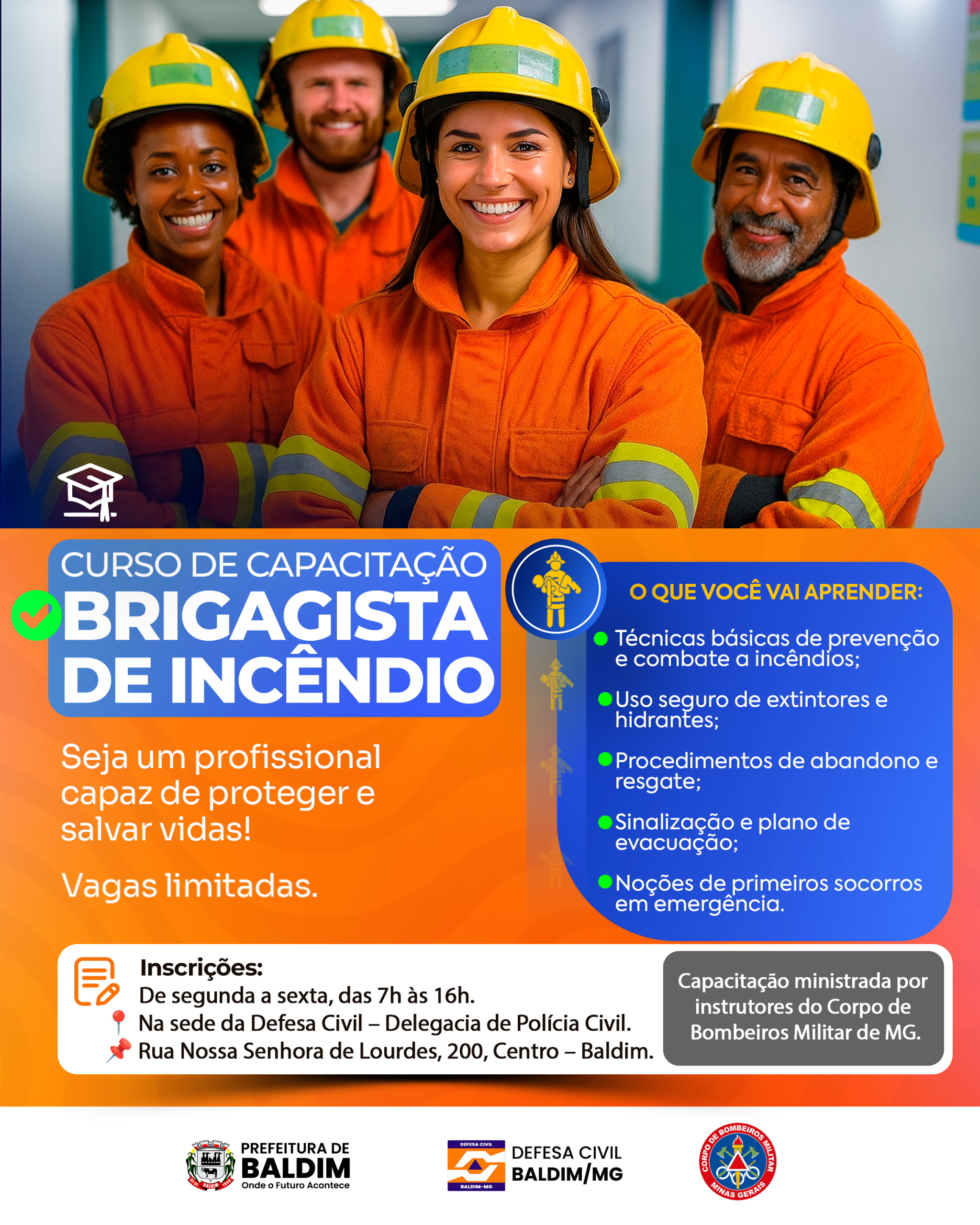 A Prefeitura de Baldim, por meio do Departamento de Defesa Civil, em parceria com o Corpo de Bombeiros Militar de Minas Gerais, realizará o Curso de Capacitação para Brigadistas de Incêndio, com o objetivo de preparar moradores da cidade para agir de forma segura e eficiente em situações de emergência.