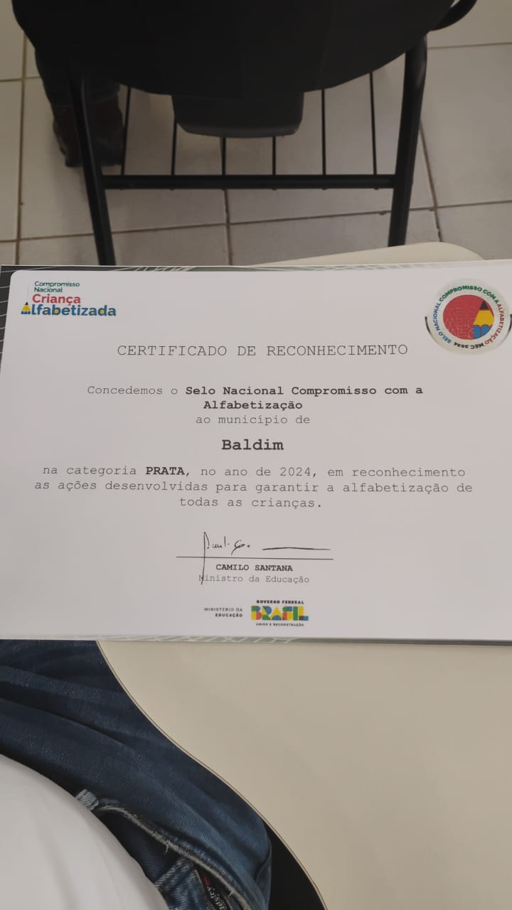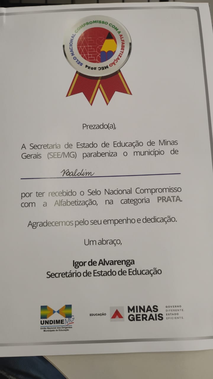 O Selo Prata atesta que Baldim está entre os municípios que mais avançaram nos indicadores de alfabetização definidos pelo Governo Federal, sendo destaque entre os demais da região.