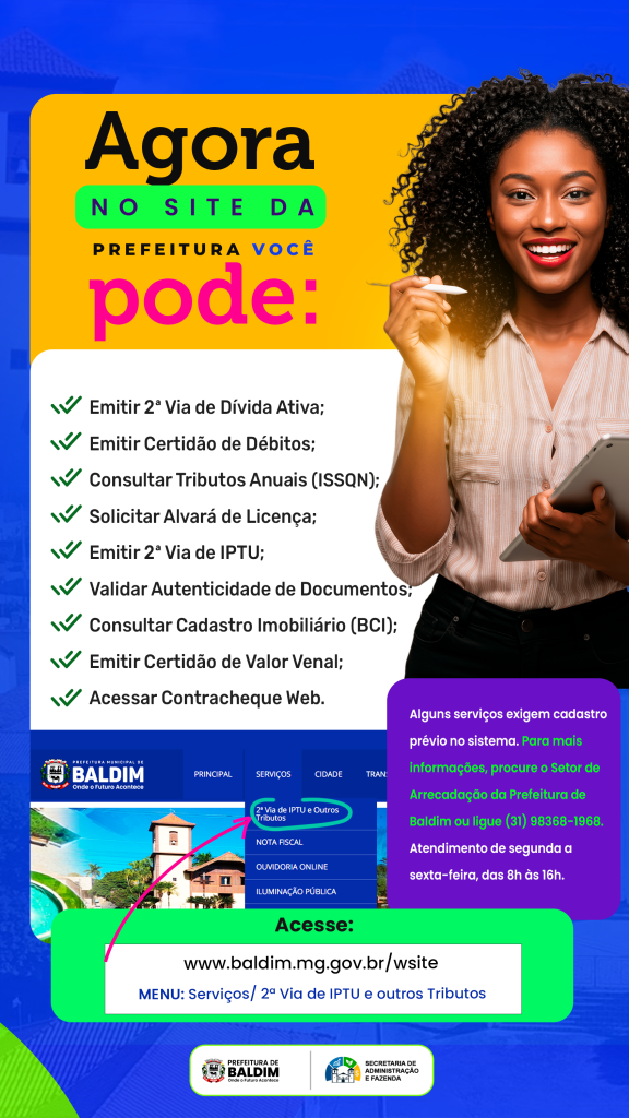 A Prefeitura de Baldim ampliou os serviços digitais oferecidos ao cidadão. Agora, por meio do Portal de Tributos e Serviços Municipais, é possível acessar de forma rápida e prática diversas opções, sem precisar sair de casa.