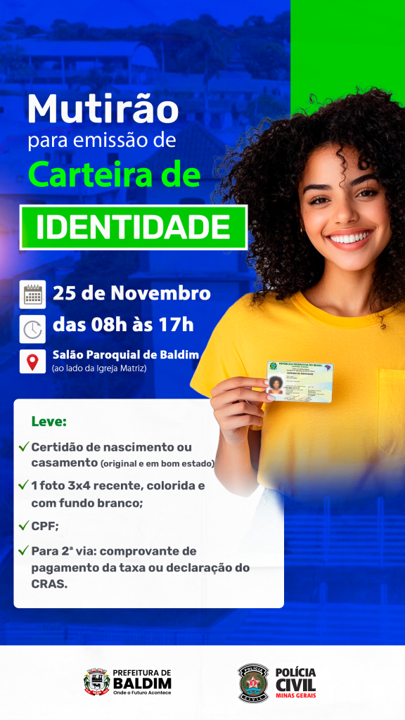 A Prefeitura de Baldim, em parceria com a Polícia Civil de Minas Gerais e o Instituto de Identificação, promove no dia 25 de novembro, das 08h às 17h, o Mutirão de Identidade, para emissão da Carteira de Identidade Nacional (CIN).